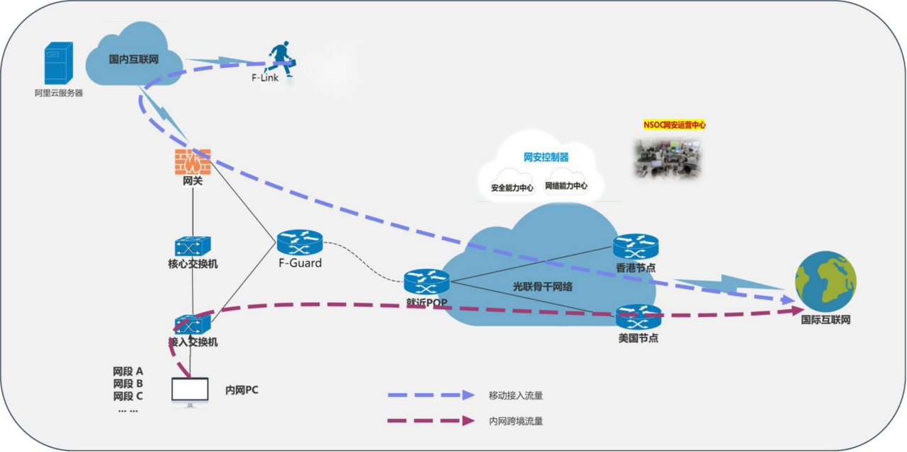Mobile office terminals securely access the enterprise's internal network through the F-Link zero-trust gateway, ensuring trusted identities and controllable access for remote employees. The F-Guard security integrated gateway can real-time identify potential internal network threats. Combined with the 7×24-hour monitoring and alarm mechanism of GLINK's NSOC Security Operations Center, it proactively defends against intrusions and virus attacks, achieving full-lifecycle protection from detection to disposal.