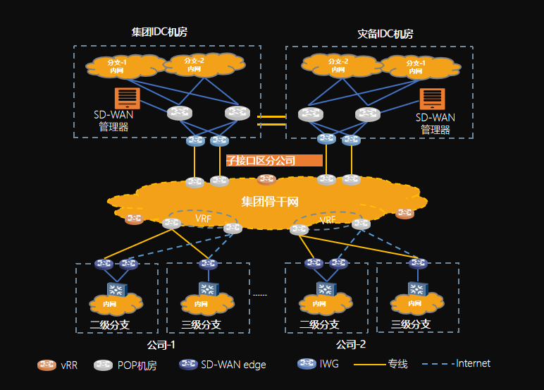 Through the establishment of a group backbone network (with three optional modes: self-construction and self-operation, third-party construction and operation, co-construction and third-party operation), all secondary and tertiary branch networks can access "One Cloud" at high speed, forming an integrated "One Network" integrating cloud, network, and security.